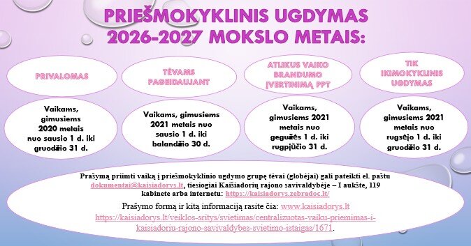 Balandžio mėnesį planuojamas vaikų priėmimas į Kaišiadorių rajono švietimo įstaigų ikimokyklinio ir priešmokyklinio ugdymo grupes nuo 2026 m. rugsėjo 1 d. Todėl kviečiame kuo greičiau teikti prašymus.