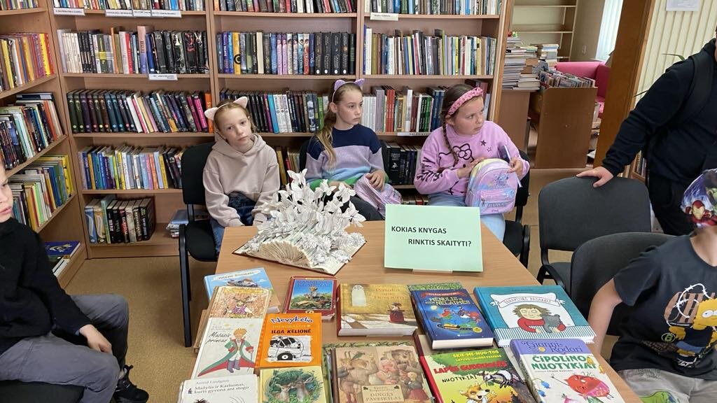 Tik įėję į biblioteką trečiokai susižavėjo ant stalo išdėliotomis vaikiškomis knygomis. Pasiūla labai plati. Bibliotekininkė Onutė Remeikaitė-Raudeliūnienė mus pasitiko, pateikė įdomių minčių apie skaitymą. Svarbiausia – pasirinkti tinkamas knygas vasarai. Kiekvienas mokinys turėjo galimybę pasisakyti apie jau perskaitytą knygą arba netgi tą, kurią skaito tėtis arba mama.